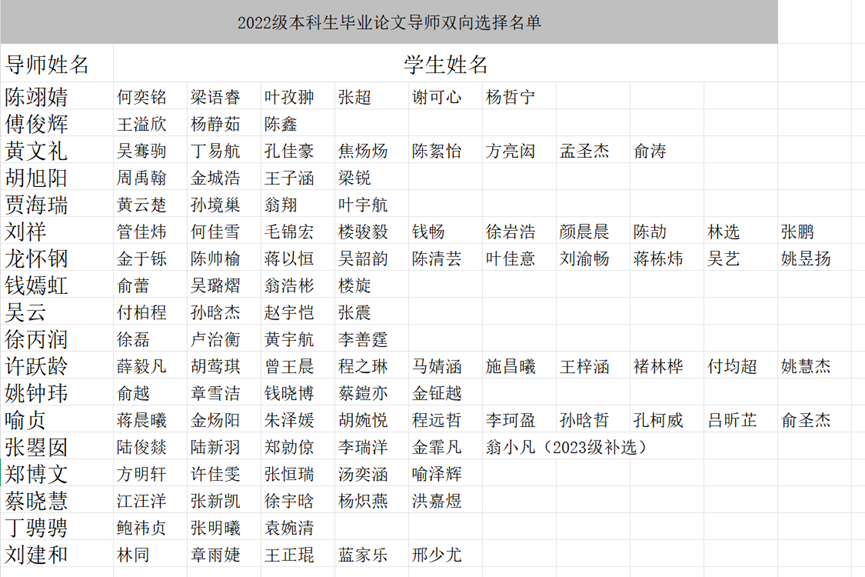经2022级本科生、毕业论文导师双向选择以及h视频 综合协调,2022级本科生毕业论文导师的具体名单现公布如下。请各位同学在本名单公布一周内主动与导师联系,以便相关指导工作的顺利开展。